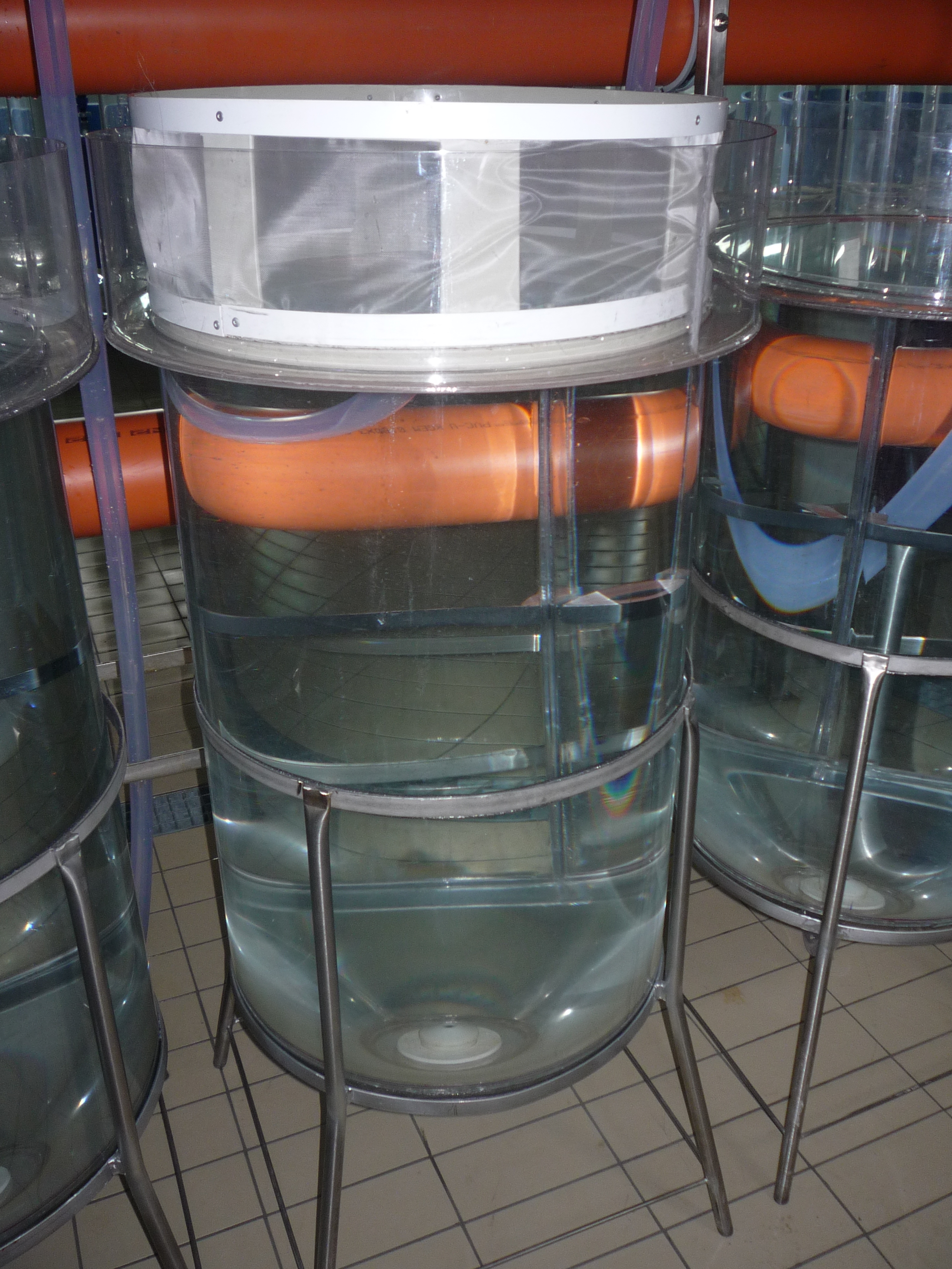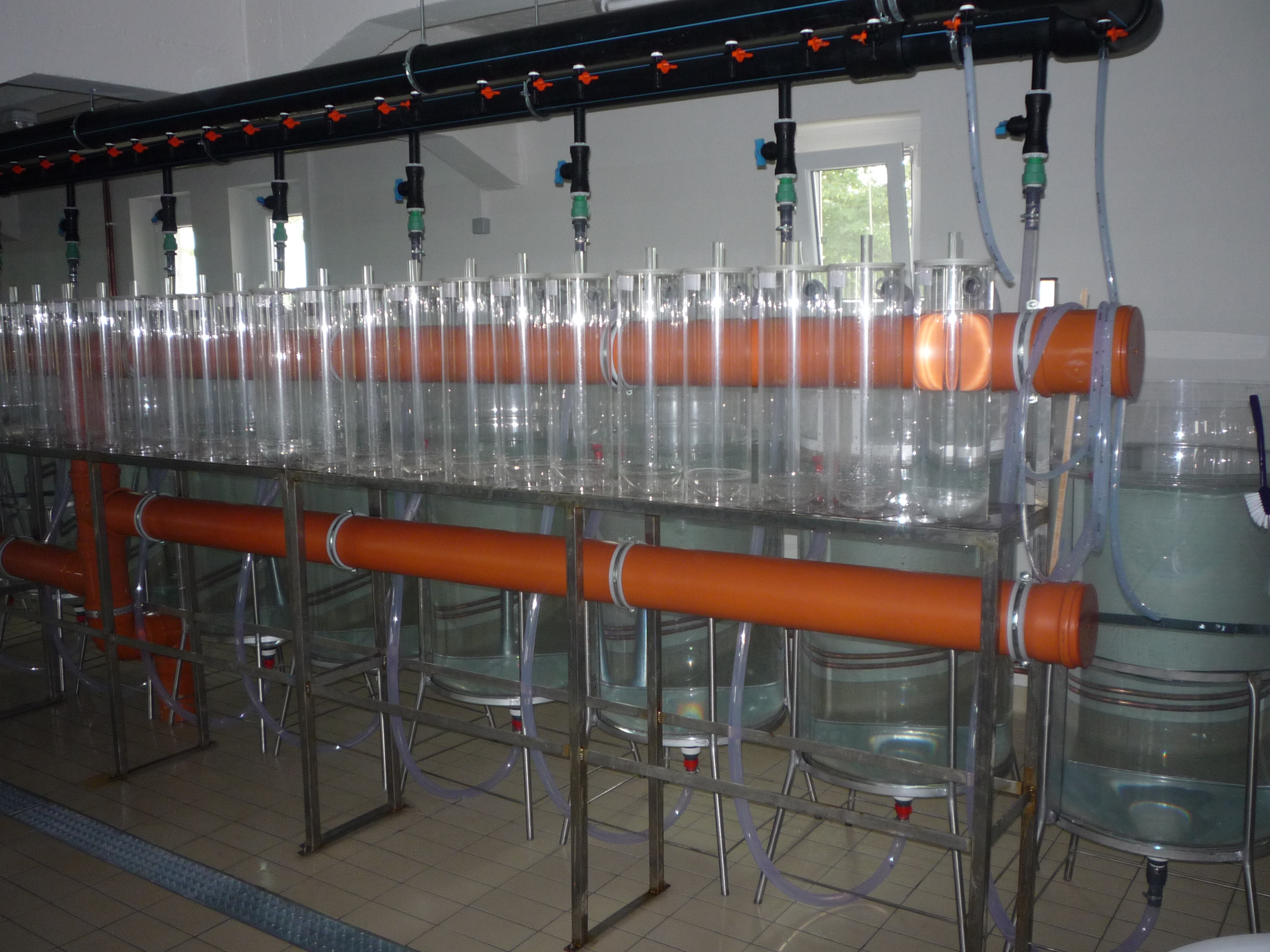 Az alábbiakban a keltetőedények telepítése, elhelyezése látható: a kifolyó víz elvezetésének módjai, a kikelő lárvák "felfogása" és tartása.